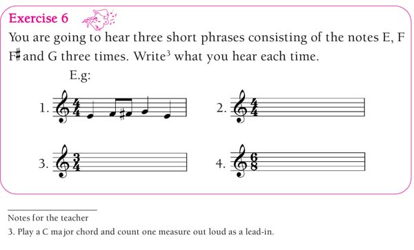the student can develop the ability to recognise different intervals, internalise the names of the pitches, develop a sense of major and minor, learn to transpose, get the feel of the tonal centre, develop rhythmic accuracy and improve their memory. Furthermore, the teacher can save valuable time, since the exercises are already written out.